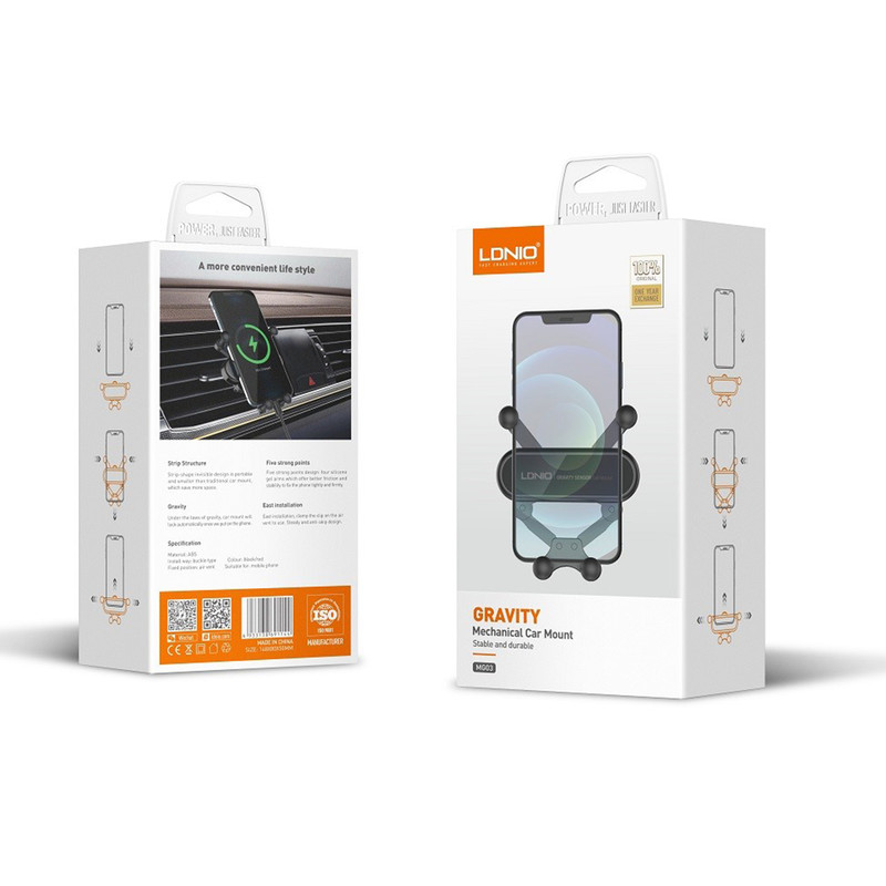 هولدر الدینیو MG۰۳ از دو بازو جمع شونده در قسمت بالا و قسمت پایین تشکیل شده است که به خوبی گوشی را نگه می دارد. در انتهای این بازوهای نگهدارنده یک پین دایره برای نگهداشتن گوشی قرار داده شده است. وقتی شما گوشی را برروی هولدر قرار می دهید این هولدر محکم گوشی را نگهداری می کند و نیاز به نصب و تنظمیات خاصی نیست. برای قرار دادن گوشی برروی این هولدر بر خلاف سایر هولدرها نیازی نیست با یک دست هولدر را نگه دارید تا گوشی را برروی آن قرار دهید. کافی است گوشی را برروی گیره های نگه دارنده هولدر قرار دهید.